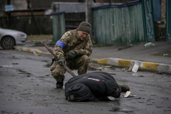 Тільки на одній з вулиць Бучі журналісти побачили близько 20 тіл людей у цивільному одязі, які лежали на тротуарах або на краю дороги.