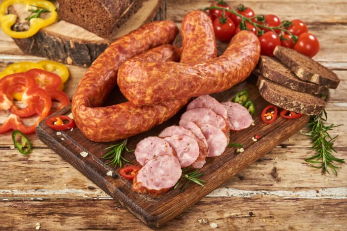 Готовій страві дати охолонути і на 4-5 годин помістити в холодильник (ковбаску можна запекти в жаровні при 200 градусах 30-35 хвилин, скориставшись рукавом для запікання, зробити зверху зубочисткою проколи).