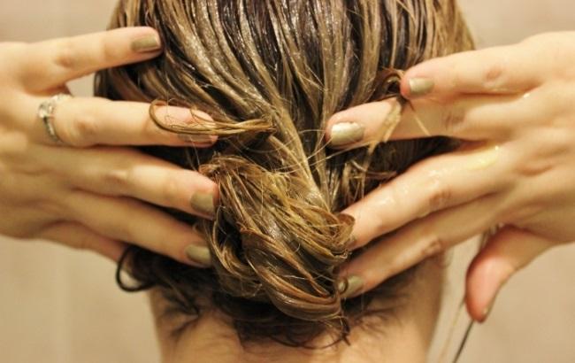 Отриману маску втирайте в шкіру голови та промасажуйте декілька хвилин. Потім розподіліть по усій довжині, а на кінчики нанесіть оливкову або кокосову олію.