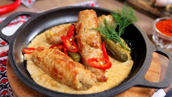 – м’ясо закрутіть рулетом. Деко застеліть пергаментним папером та викладіть на нього рулети. Полийте зверху трохи рослинним маслом, щоб м’ясні рулетики при запіканні не підсохли.