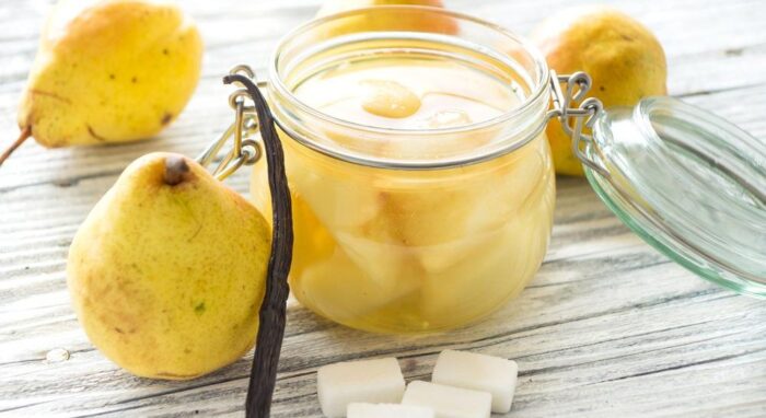 Після складіть груші у чисту банку та залийте окропом. Прикрийте кришкою та залишіть постояти кілька хвилин.