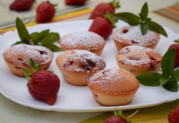 – формочки для кексів наповніть (по 1 столовій ложці тіста), викладіть в кожну форму полуничку і заповніть тістом до верху.