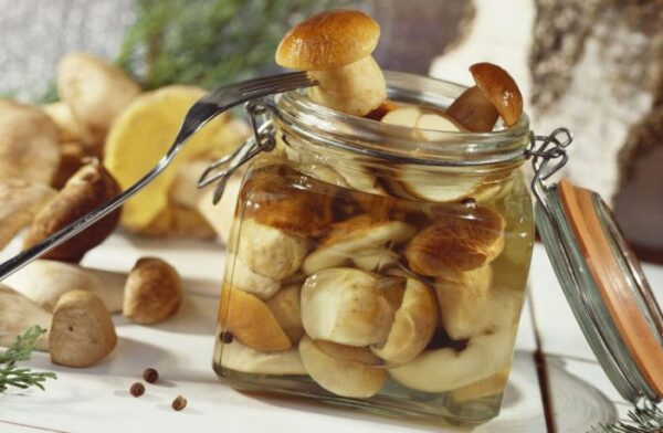 – зваріть маринад ( у даному рецепті на 1 кг грибів). 3 чайні ложки солі, 11 горошин чорного перцю, 5 горошин запашного перцю, два лаврових листка, 4 гвоздики, 4 столових ложки 30% оцтової кислоти, половина чайної ложки цукру, дві склянки води.