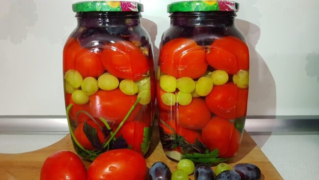 – у стерелізовані банки викладіть помідори і виноград. (перекладайте шарами)