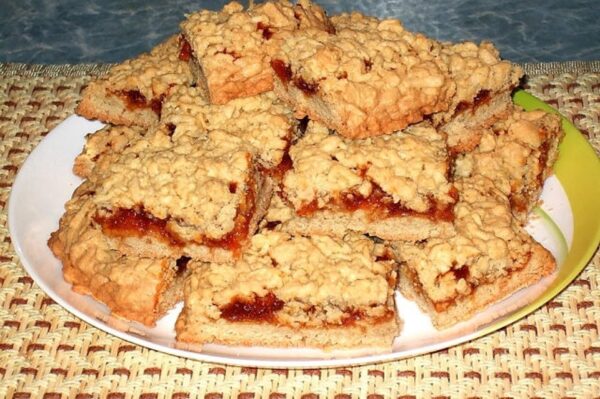 – остиглий корж змастіть повидлом. Викладіть другий корж і змастіть повидлом. Зверху посипте крихтою. Залишіть на пару годин і розріжте на шматочки.