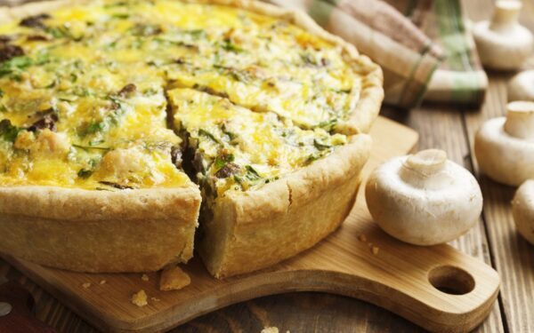– на злегка запечену основу пирога викладіть шампіньйони з цибулею. Залийте гриби сумішшю сметани, яєць та сиру.