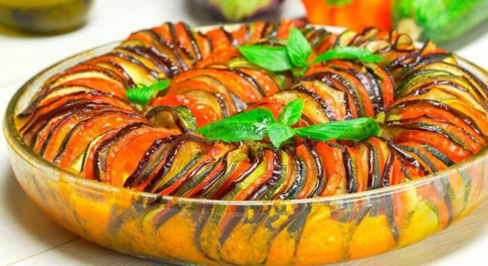 Візьміть форму для страви. На дно покладіть соус. Баклажани, кабачки, томати наріжте тонкими слайсами та викладіть почергово у форму. Зверху налийте соус, що залишився.
