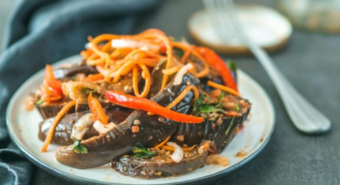 Змішайте сіль, цукор, оцет, подрібнені часник, гіркий та солодкий перець разом із баклажанами.