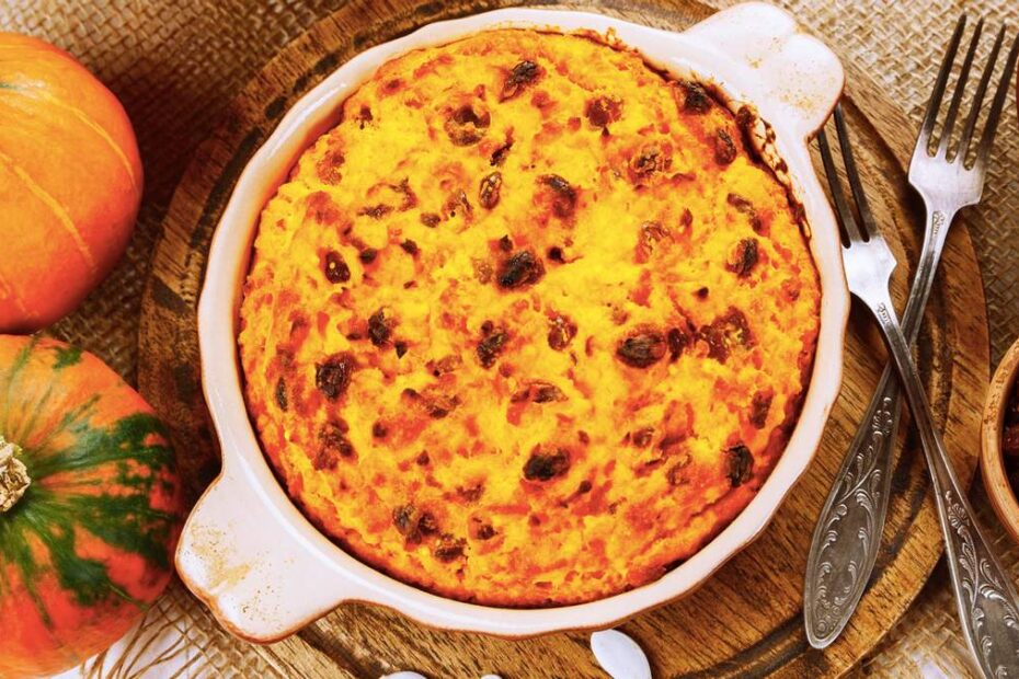 – форму для запікання змастіть вершковим маслом та посипте манною крупою. Викладіть гарбузово-сирну масу.