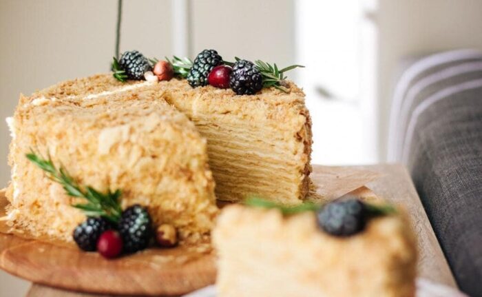 Залишилося лише зібрати та прикрасити наш сирний Наполеон: промазуємо коржі кремом та посипаємо зверху крихтами від коржів, якщо є бажання — також можна прикрасити фруктами.