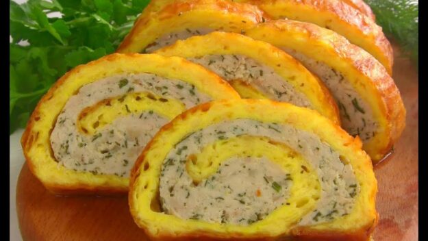 – готовий сирний омлет змастіть м’ясною начинкою, сформуйте рулет. Потім рулет загорніть пергаментним папером.
