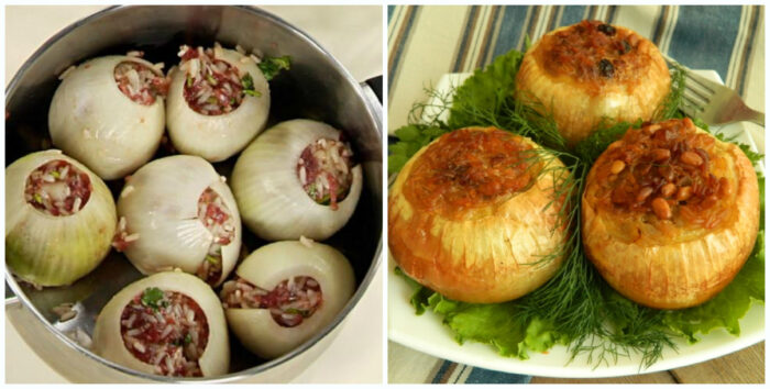 З фаршу сформувати кульки, обгорнути їх скибками бекону, зафіксувати зубочисткою, зверху – кільця цибулі.