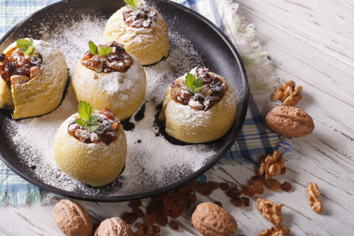 Delicious baked apples with raisins, walnuts and honey on a plate close-up horizontal